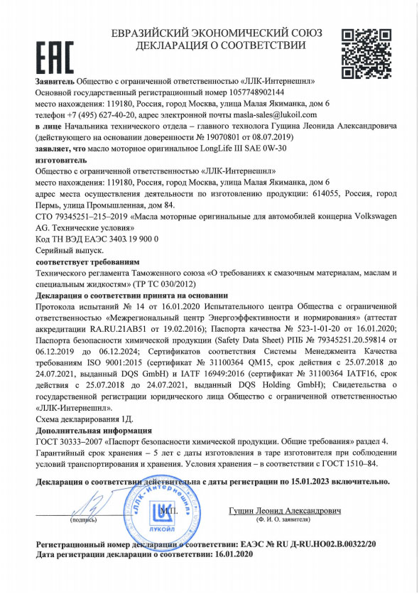 | Вид масла | Синтетическое |