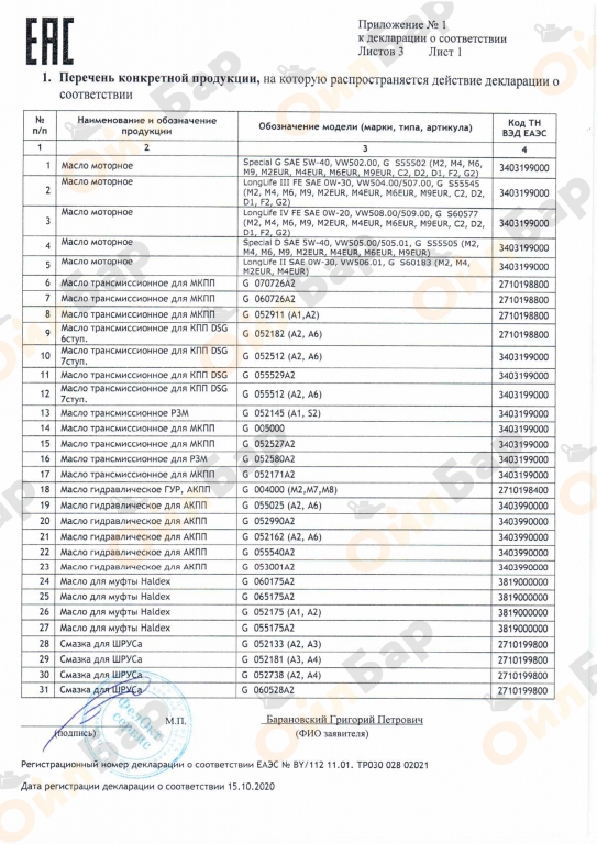 Наименование - Масло трансмиссионное